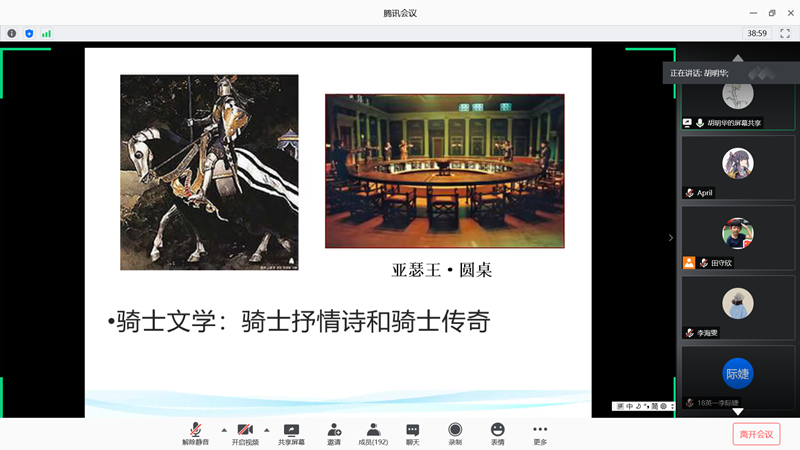本次讲座中,胡明华老师首先明确了对于西方文化批判性吸收的态度,为讲座奠定立场基调。胡明华老师以“两大源头”和“六大思潮”为中心重现西方文学的脉络,并以此为主线,逐一讲述各阶段西方文学的特点。在老师的讲述中,西方文学的画卷缓缓展开。不同时期的西方文学各具特色,这反映出各时期西方人民不同的精神需求。胡老师以如《罗马史诗》《圣经》等著名的西方文化作品为例,详尽地讲述了西方文化发展特点,并突显了古罗马文化、希腊文化重要的奠基作用,同时列举了骑士等西方文化的典型标志形象,展现了这些中国文化世界不曾出现过的文化标志所蕴涵文化意义。此外,在梳理文化脉络的过程中,我们对耳熟能详的历史事件有了更深层次的文学意义,历史人物有了更丰富的文化内涵。时代背景与文化作品相映照,胡明华老师联系社会环境因素对各时代涌现出的文学作品进行深层解读,充分体现出来西方文化环境对文学的反映。