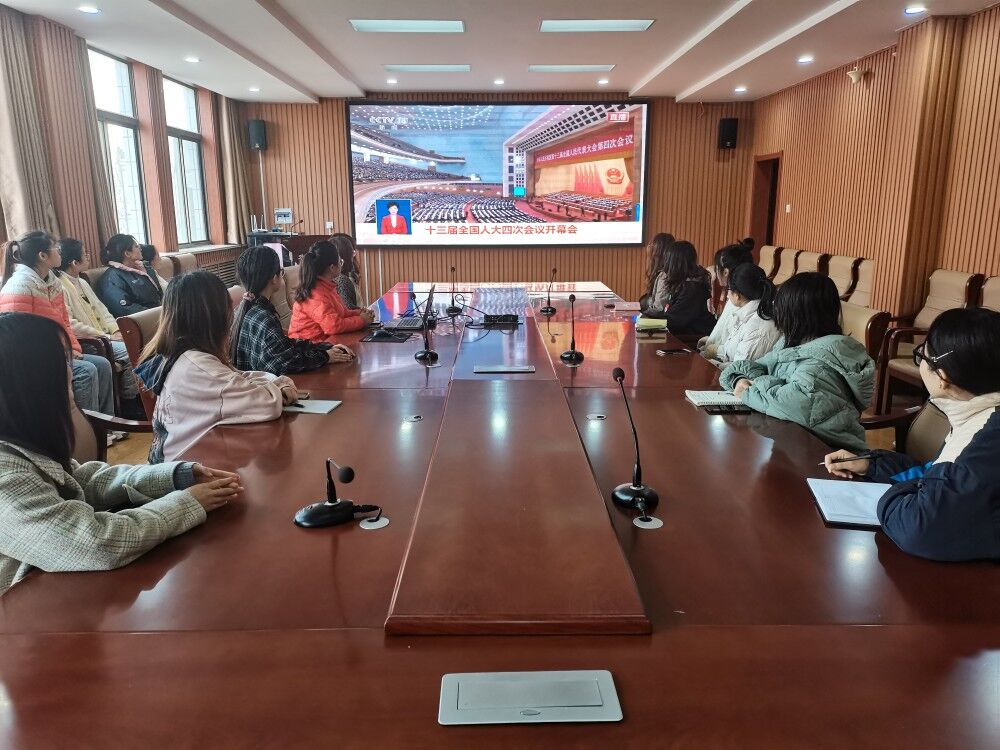 师生观看十三届全国人大四次会议开幕仪式。观看此次开幕式的有学院团委老师张晓,辅导员王伟、赵文彬及学生骨干。