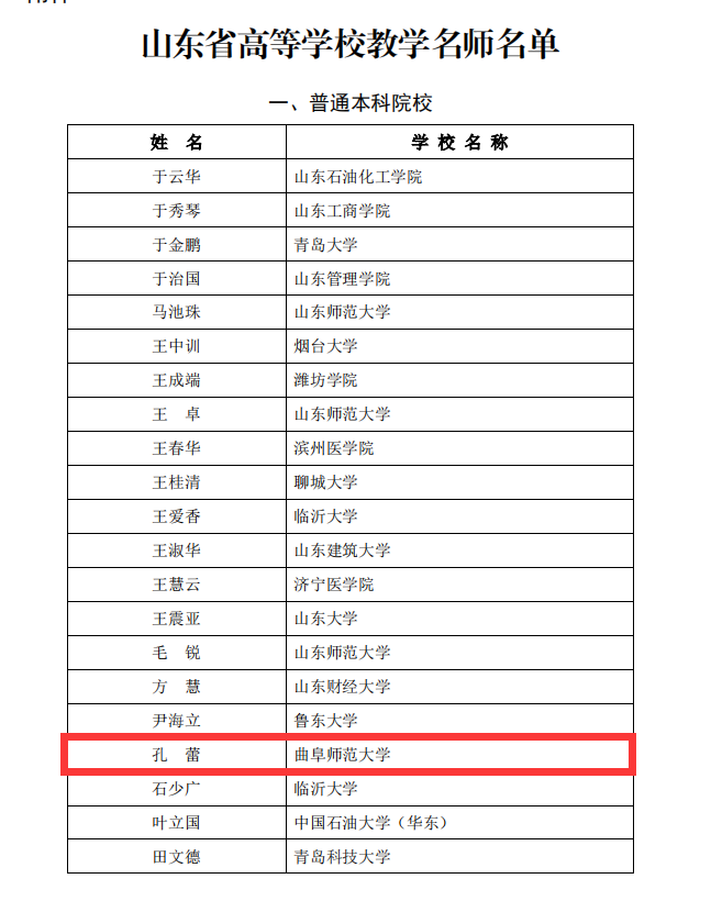 近日,山东省教育厅公布“2020年山东省高等学校教学名师”名单,黑料社 孔蕾教授荣获“2020年山东省高等学校教学名师”称号。