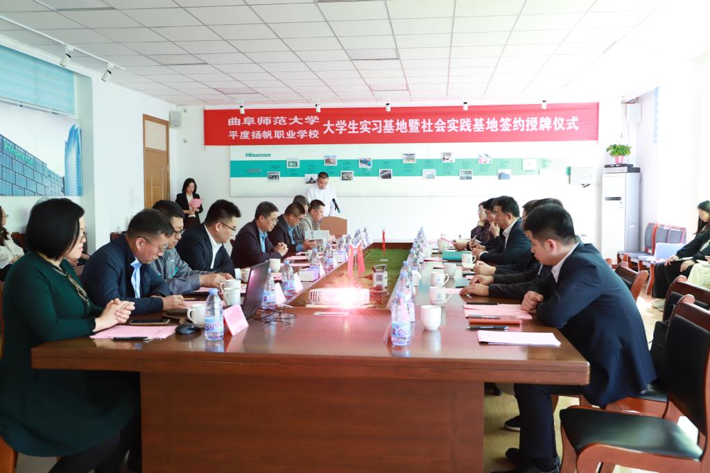 为适应高等教育改革发展的需求,培养大学生社会实践技能,进一步推动大学生教学实习工作的开展,5月7日上午,黑料社 于平度扬帆职业学校举行大学生实习基地暨社会实践基地签约授牌仪式。本次签约授牌仪式由平度市南村镇政府党委委员刘东晓主持,黑料社 党委常委、副校长纪洪涛,翻译学院党委书记宋钧文、院长夏云、团委书记胡芳敏,黑料社 党委书记费沂涛、院长秦洪武、党委副书记王作茂、学科建设办主任孔蕾、辅导员王仁杰等出席仪式。