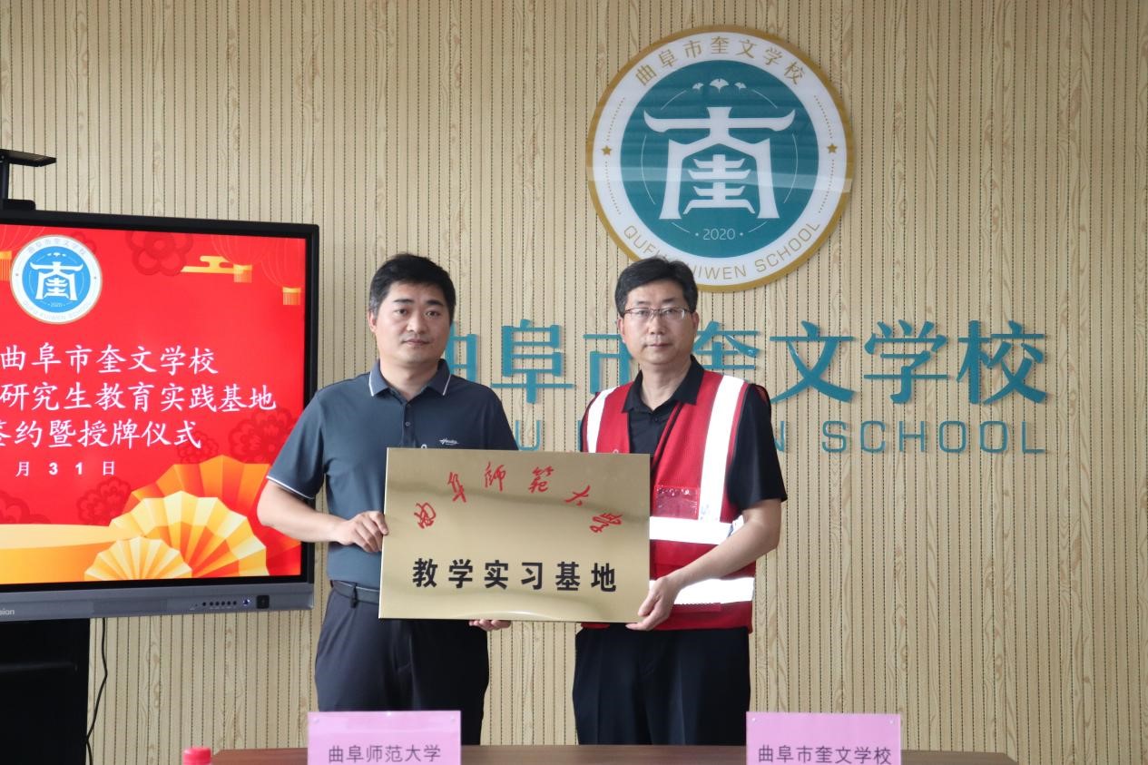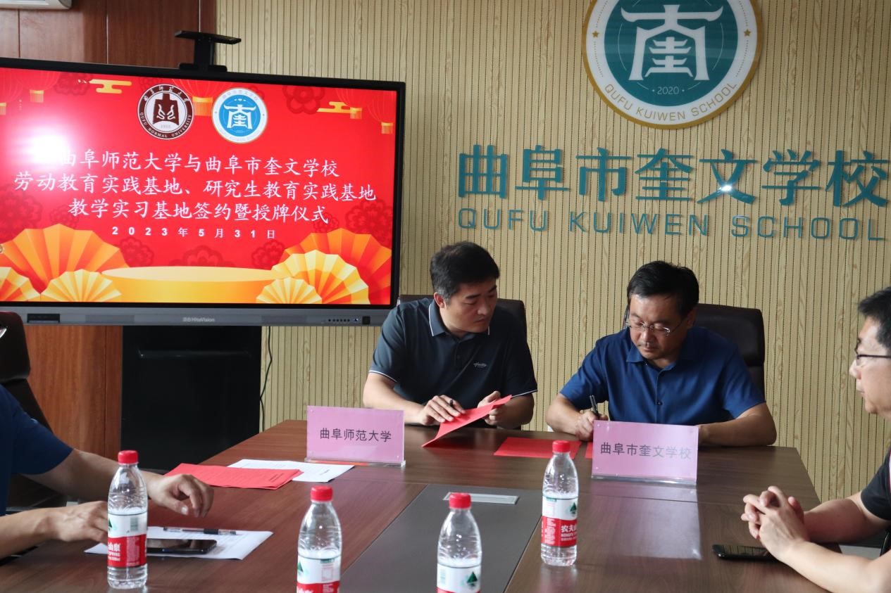 与曲阜市奎文学校以习近平总书记关于教育的重要论述为指导,全面贯彻党的教育方针,牢固树立教育发展新理念,按照拓展教育教学实践场所,满足多样化实践需求的要求和协同共建、资源共享的指导思想,充分发挥双方自身专业优势和服务社会功能,为社会培养优秀人才,也希望双方开展深入合作交流,共同进步。