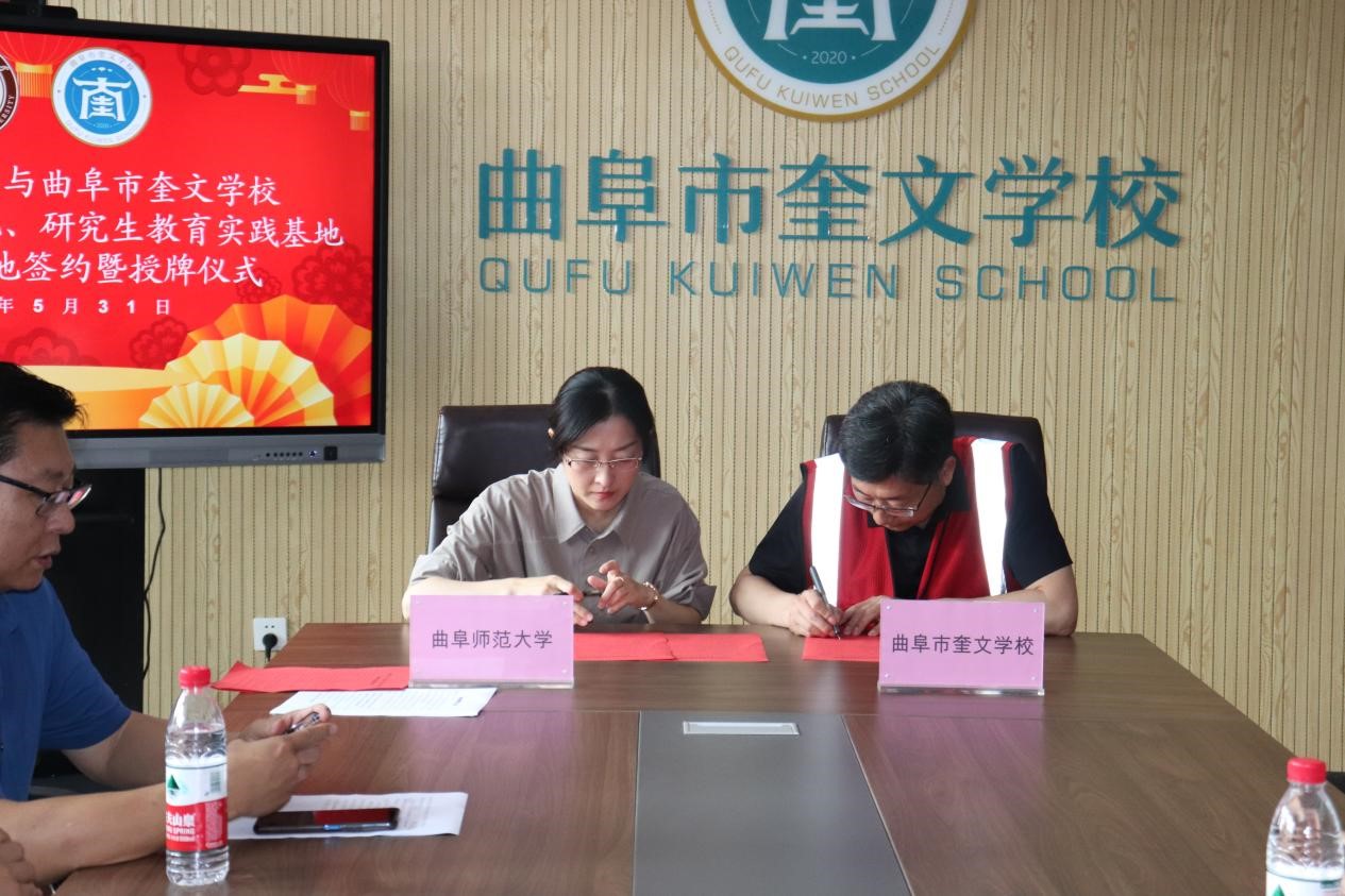 孔蕾教授与曲阜市奎文学校副校长李良签约研究生教育实践基地协议书并分别授牌。