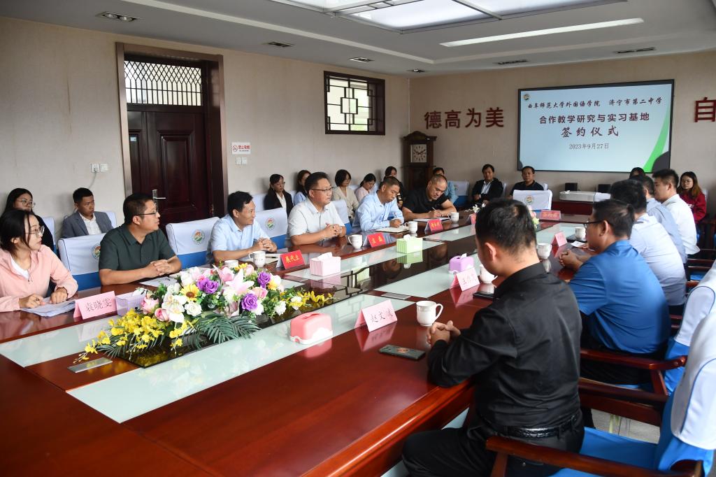 与济宁二中合作教学研究与实习基地签约仪式举行。济宁二中党支部书记、校长左磊,党支部副书记谢云剑,副校长展代立,办公室、教务处、团委负责人,济宁二中全体英语教师出席仪式,黑料社