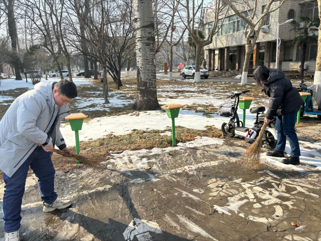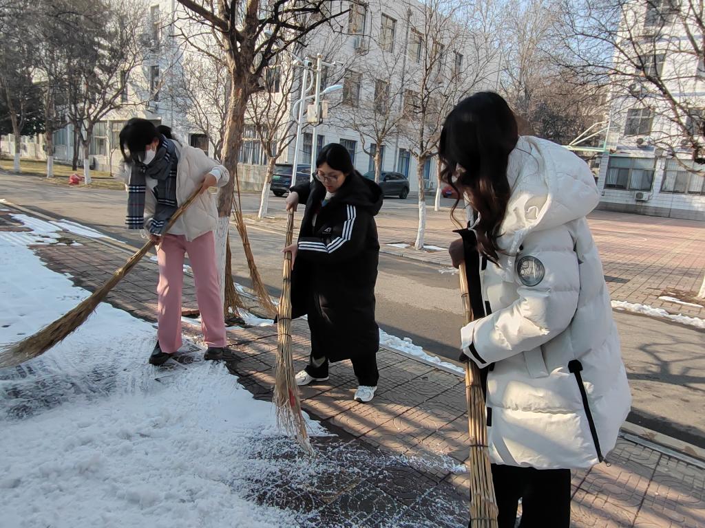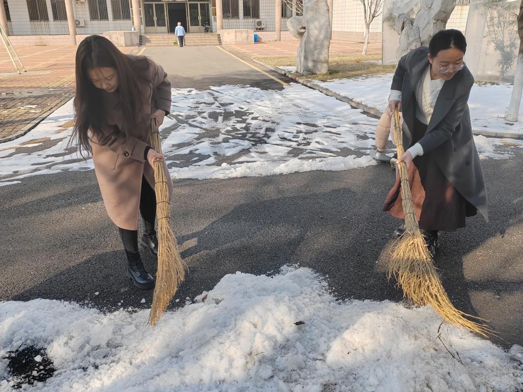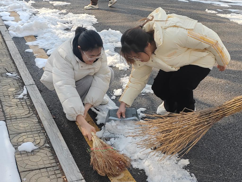 活动现场,志愿者们不惧严寒风雪,齐心协力,有序分工。他们手持扫帚、铁锹、水桶等工具,认真清扫着学院周边的主要道路、出入口等重要区域的积雪,以及墙体上的冰凌,铲雪、除冰、清运,各个岗位协同作战,默契配合。经过数小时的辛勤努力,各条主干道、教学楼前、楼梯和出入口等地积雪基本清理完毕,极大的排除了冰雪天气学生返校潜在的安全隐患,为师生的出行提供了保障。