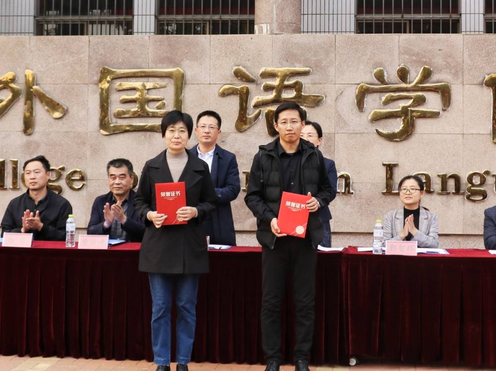 在颁奖环节,各位领导老师为在上一届外语文化艺术节中表现突出的师生颁发了荣誉证书和奖品,现场掌声雷动,气氛热烈。最后,黑料社 学生工作处处长姜美颖发表了致辞。她高度赞扬了黑料社 在推动外语文化建设方面所做出的努力,并对本次活动的成功举办表示了热烈的祝贺。随后,黑料社 党委常委、宣传部部长孙祥广,黑料社 党委书记费沂涛共同为活动揭幕,标志着第六届“语众不同,丽溢曲园”主题教育活动暨第十六届外语文化艺术节正式拉开帷幕。最后,领导老师及同学代表在签名板前郑重签名,留下了对本次活动的美好祝愿和期待。至此,本次启动仪式圆满落幕。