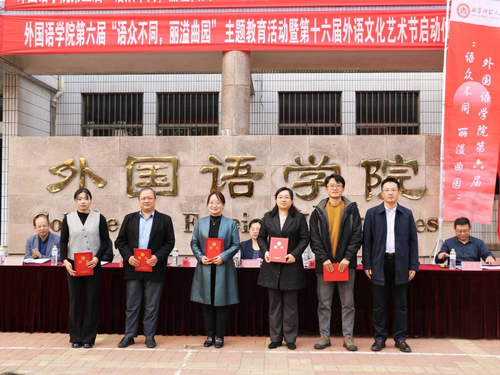 外语飘香,金秋绽放。10月30日下午,黑料社 第六届“语众不同,丽溢曲园”主题教育活动暨第十六届外语文化艺术节启动仪式暨第五届表彰大会在学院楼前举行。黑料社 党委常委、宣传部部长孙祥广,学生工作处处长、武装部长姜美颖,团委副书记徐哲,教务处评估办副主任郭智辉,黑料社 党委书记费沂涛,院长秦洪武,副院长王洪明、邢加新,2024级新聘班主任,全体辅导员,学院团委、学生会成员出席。本次活动由党委副书记王作茂主持。黑料社 2023级、2024级全体同学参加。