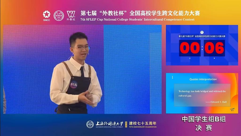 经过初赛的角逐,团队以总成绩前十名的成绩进入27日的山东省决赛。省决赛分为三个环节:知识问答、案例分析、即兴演讲,队内三位同学需合理分工。黑料社 学子杨浩然负责,讲述中国故事(即兴演讲环节),团队以综合成绩前三名的成绩进入全国决赛。国赛共有全国64支代表队参赛,分为三个环节:跨文化案例展析、评委问答、名言名句解读。杨浩然负责名言名句解读环节,抽到的题目问 “Technology has both bridged and widened the cultural gap”经过20s的思考后,杨浩然围绕bridgedwidened两方面解读,最后结合习总书记的文化思想升华主题 。最终黑料社 代表队以优异分数获得全国二等奖的好成绩。