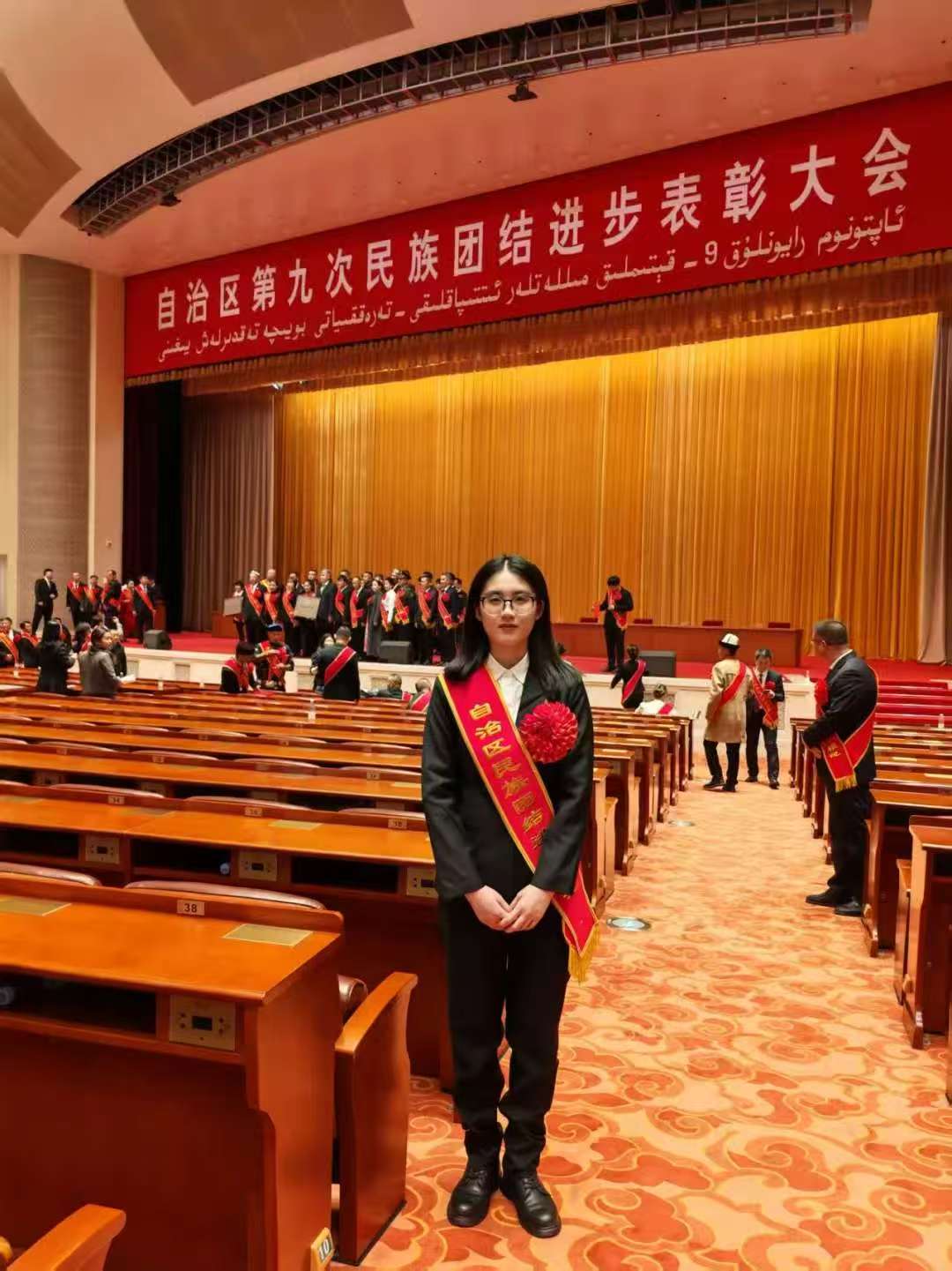10月16日上午,自治区第九次民族团结进步表彰大会在乌鲁木齐市召开,来自阿克陶县巴仁乡萨依巴格村小学的西部计划志愿服务队荣获模范集体。黑料社 2019级法语班常晴同学作为服务队代表,光荣领取集体奖项。