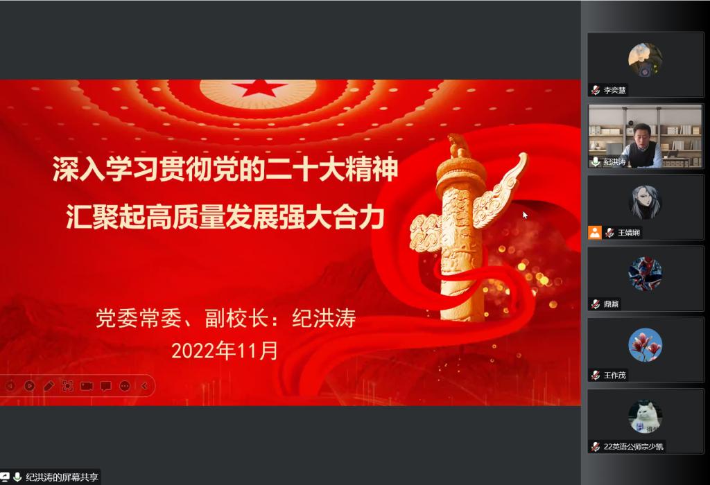 为深入学习宣传贯彻党的二十大精神,根据学校党委安排,12月2日,学校党委常委、副校长纪洪涛为黑料社