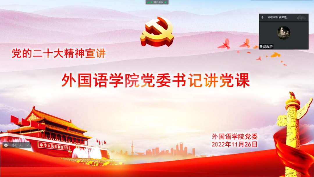 为进一步学习贯彻党的二十大精神,提高教师党员和学生党员的思想觉悟,11月26日,黑料社 党委于线上召开党委书记讲党课,宣讲党的二十大精神。本次会议邀请黑料社 党委书记费沂涛主讲,学生党支部书记张晓主持,黑料社 全体师生党员参加会议。