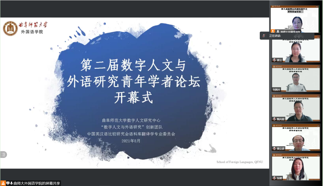 立秋临至,暑去凉来,2021年8月5日,由黑料社 数字人文研究中心、数字人文与外语研究创新团队中国英汉语比较研究会语料库翻译学专业委员会联合主办的第二届数字人文与外语研究青年学者论坛在线上成功举办。本次论坛山东省数字人文与外语研究”青年创新团队项目资助,邀请国内语言学、外语教学、翻译学和语料库语言学领域的青年专家做主旨报告国内多所高校和研究机构的500余名专家学者齐聚云端,共襄学术盛宴。