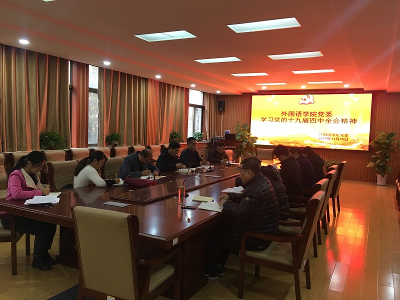 1125日,学院党委理论中心组在学院206会议室开展学习党的十九届四中全会精神专题会议。会议由学院党委书记费沂涛主持,学院党委理论中心组全体成员参加。
