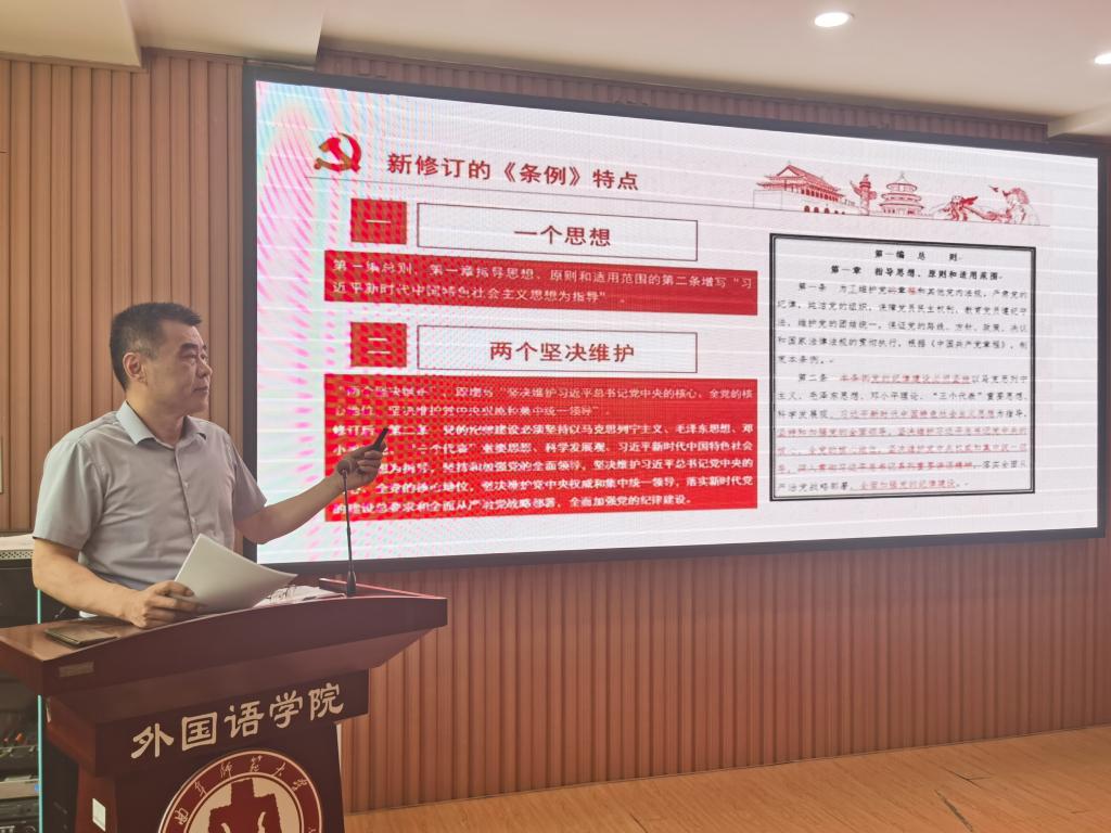 党委书记费沂涛于外语楼206会议室面向学院全体党员骨干开展“严守党的纪律,强化责任担当”党纪学习教育专题党课活动。