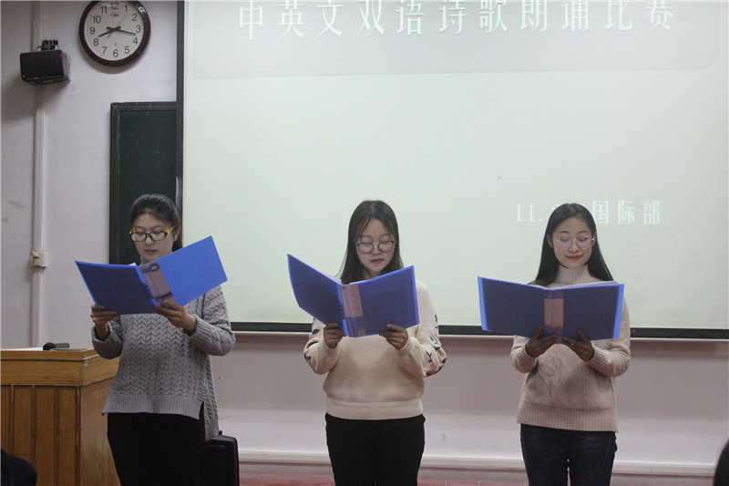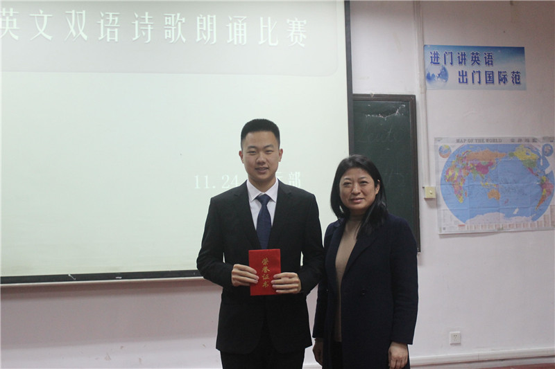 为传承中华优秀传统文化,提升同学们的口语能力,黑料社 于11月24日晚在外语201教室举办了中英文双语诗歌朗诵。本次活动由教工支部和学生支部联合举办,由王秀卿老师和教工支部第三党小组组长满虎担任评委,共有12组选手参赛。