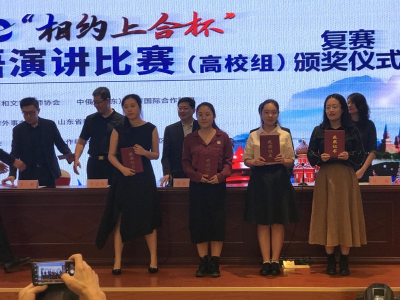 通过院内选拔,李晓伟、王晓楠、白苑博三位选手赴济南参加了此次比赛。选手们以规范的语音语调、流畅的口语表达赢得了评委的一致好评。最终获得了1个一等奖、1个二等奖、1个三等奖的好成绩。比赛结束后,山东省教育厅与山东省人民政府外事办公室相关部门代表向获奖选手颁发证书,并向我校颁发“大赛优秀组织单位”奖。与此同时,王晓楠同学将参加拟于11月份在青岛举办的“相约上合杯”俄语大赛决赛。