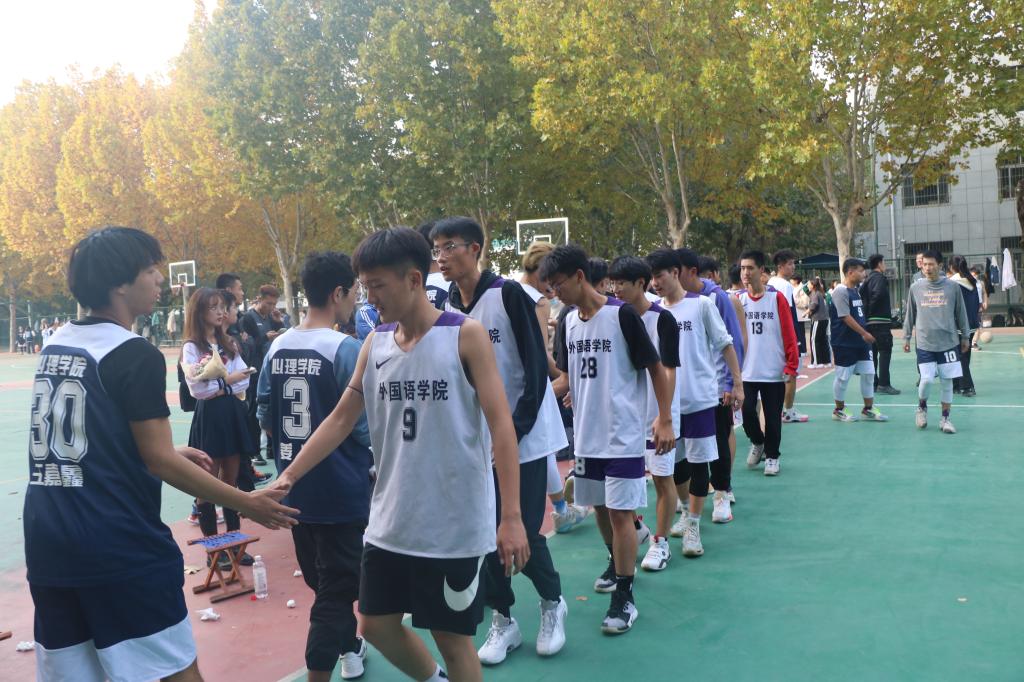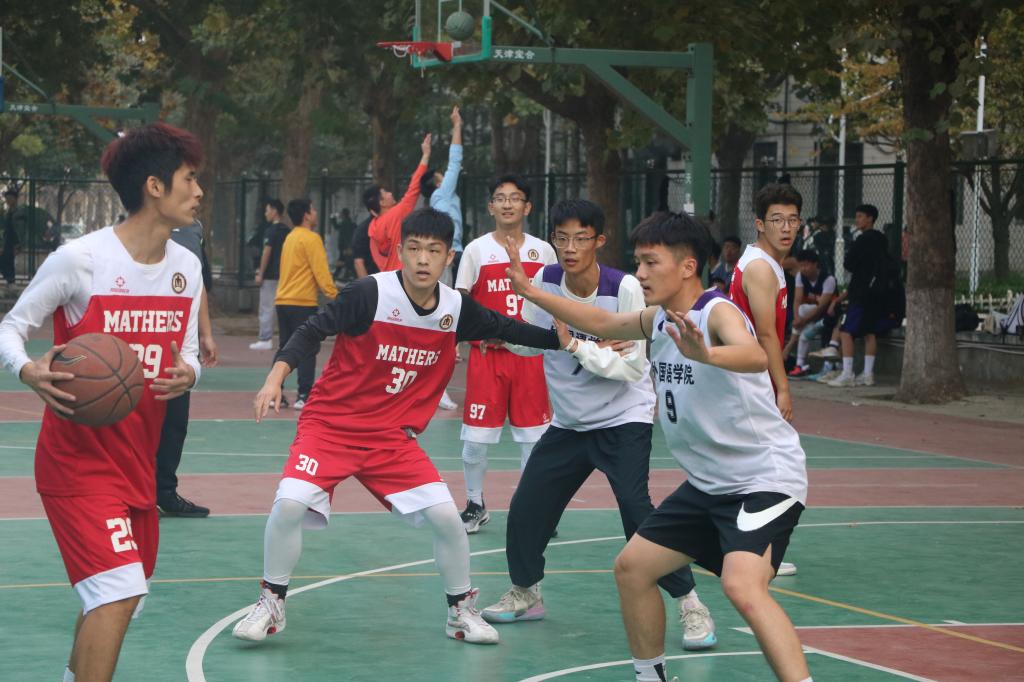 怀着坚定的信念,队员们沉着冷静,稳扎稳打,抢下一个又一个篮板,熟练的传球与严密的防守赢得了观众们热烈的掌声。比赛过程中,女篮队员刘正涛带球突破对方防线,精准投篮,鼓舞了外院女篮的士气,将比赛推向了高潮。男篮比赛同样热火朝天,队员们你追我赶,争分夺秒,以钢铁般坚固的防守成功抵御对方进攻。27日下午两点,小组赛最后一场比赛正式开始。其中男篮队员潘帅的三分球让队友欢呼,令观众沸腾。轮到我方进攻,队员们犹如长矛一般,势如破竹,精准地将球投入篮筐。面对如此精彩的比赛,观众们的情绪非常高涨,一声声的呐喊,一次次的掌声,展现了外院学子积极昂扬的风采。最终,外院男篮在观众们的欢呼声中赢下了本场比赛。