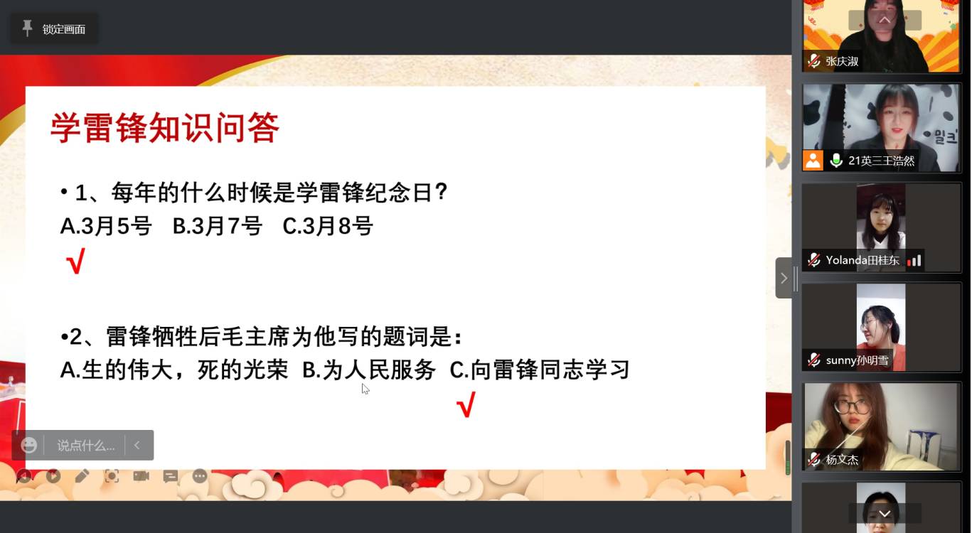 于3月14日举办“雷锋精神我传承,青春闪耀新时代”主题团课活动。本次主题团课由各班团支书线上主持,全体同学积极参与。