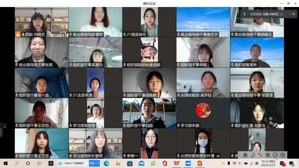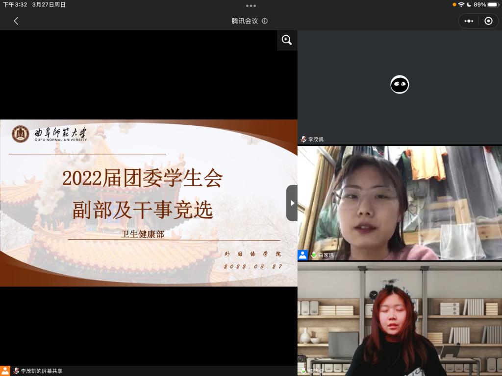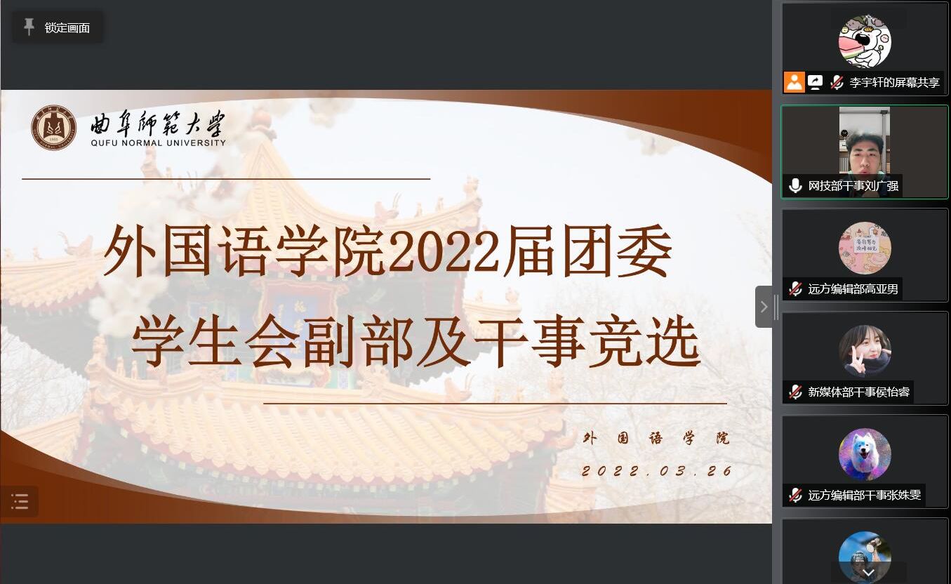 举行团委学生会副部长换届竞选活动,本次竞选活动通过线上方式进行。学院团委副书记张晓,辅导员赵文彬、王伟、王仁杰,2022届主席团及学生会各部门部长担任评委,各部门干事积极参与。