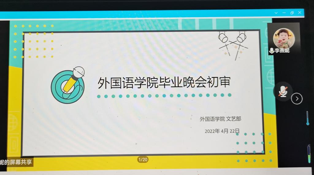 本次初审通过腾讯会议屏幕共享形式进行展示,选手通过抽签决定出场顺序。20级英语师范一班李欣怡动听的歌曲《一路生花》为初审拉开了帷幕。18级英语师范二班王玲玲演唱的《你曾是少年》情感真挚动人,歌声婉转轻灵,抒发了毕业班师姐真挚的毕业情感,令人动容。21级英语师范二班唐艺宁、王迪等人的情景剧《时间都去哪了》幽默风趣,发人深省。20级英语师范三班白家玮、高曦、丁彦心的英文诗朗诵发音标准,情感丰富,展现了独特的专业魅力。21级公师班陶踪令的京剧《霸王别姬》余音绕梁,别出心裁,充分展现了传统文化的魅力。经过初审团的严谨商议,最终决定出二审同学名单,进入下一轮准备。