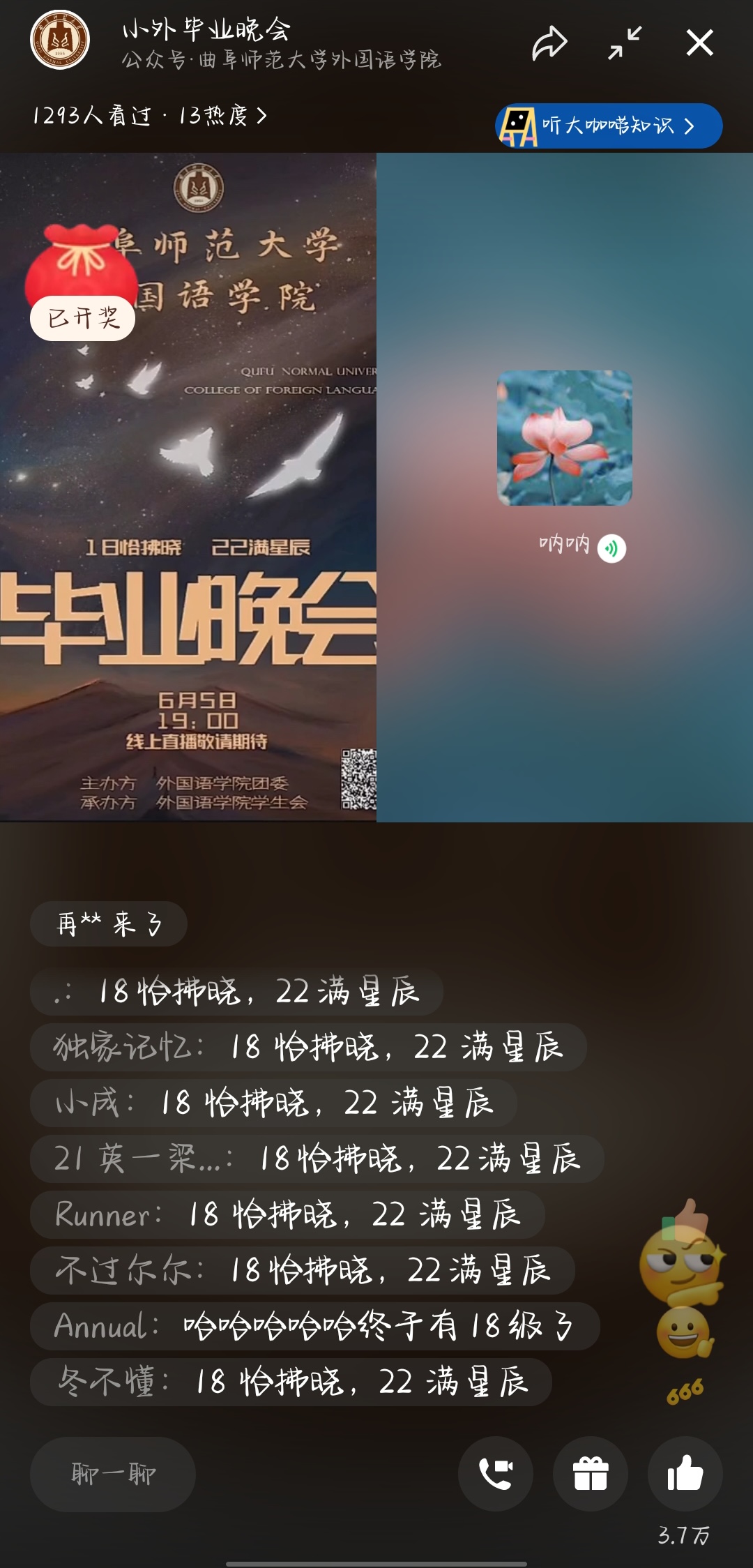 除了丰富多彩的节目,本次晚会还设有激动人心的弹幕抽奖和现场连麦环节,现场观众通过发送弹幕以及与主持人现场连麦表达了对毕业生们的诚挚祝福。而后,小品《天不怕地不怕就怕老师找我爸》用诙谐幽默又感人动情的舞台表演传达出一段温馨的师生情谊,演员们活灵活现的表现使观众忍俊不禁,拍手叫好,将气氛推向高潮。柳腰轻,莺舌啭,歌伴舞《万疆》用恢弘大气的歌曲和柔美的民族舞表现出学子们热切的家国情怀。最后,师生合唱《不说再见》里一帧帧感人至深的画面让全体观众为之动容,观众们纷纷发送弹幕表达自己的真心祝福,为晚会画上了浓墨重彩的句号。