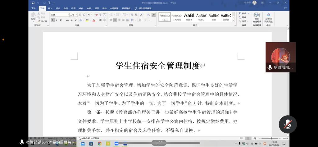 为使新生了解宿舍内务与卫生检查细则,9月16日,宿管部部长冷婷雯主持召开了“学生宿舍管理制度”讲座,讲解学生宿舍安全管理制度。经过短暂休息,宿管部部长冷婷雯与卫生健康部部长白家玮共同召开“宿舍内务整理和教室卫生”讲座,介绍卫生健康部门的工作和卫生检查细则。整个会议过程中,2022级的同学们表现积极,纷纷表示受益匪浅。
