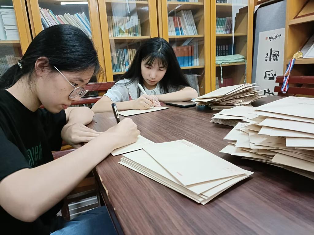 全体师哥师姐为即将报到的2022级新生写信。书信的内容形式丰富多彩,有的用英语记录大一生活的多姿多彩;有的图文并茂,优美的小楷书写对新生的祝愿;有的是一首小诗,用韵脚的“喜”字传播新生开学的喜讯;有的是一首歌,用欢快的歌词奏响新生开学的曲调。