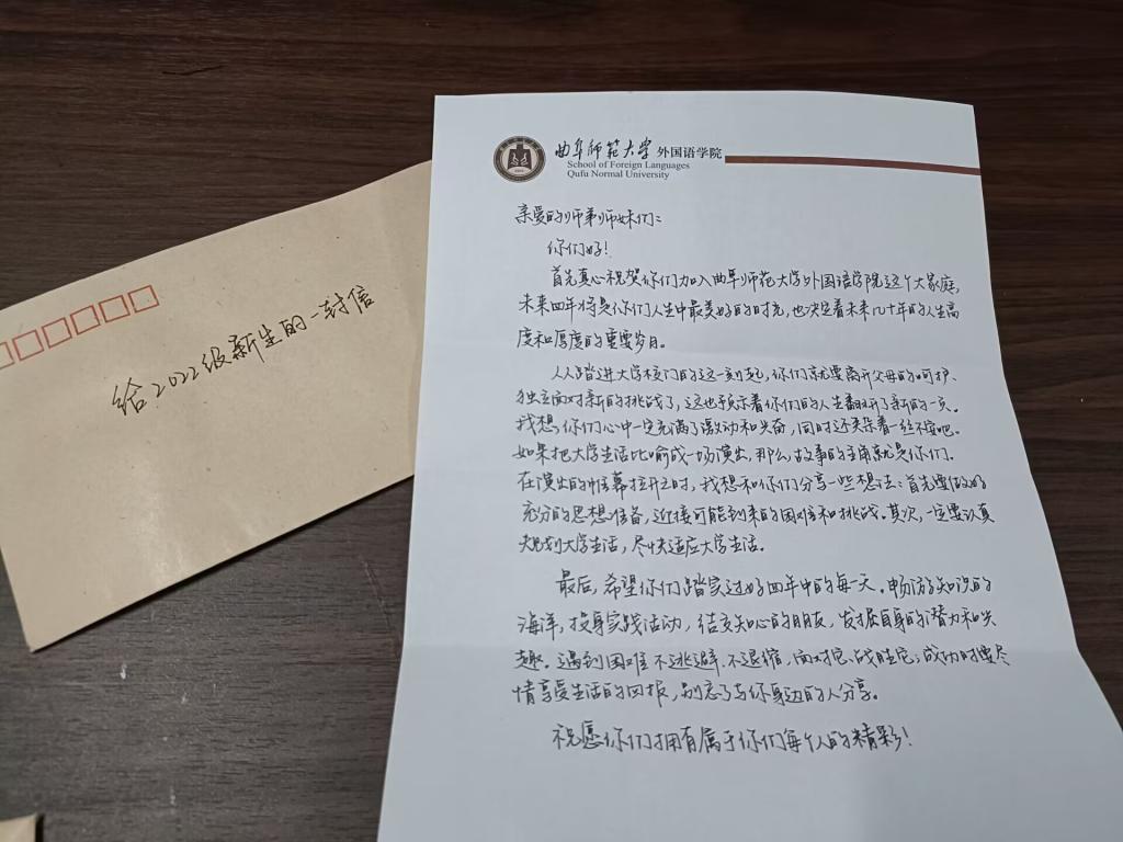 报到第一天,新生陆陆续续进入宿舍,刚进门就发现信封静静地“躺在”书桌上,信封上标记着“给2022级新生的一封信”,新生们满怀期待地打开信封。有的新生被信的内容鼓舞,立志成为像师哥师姐一样优秀的外院学子,在黑料社