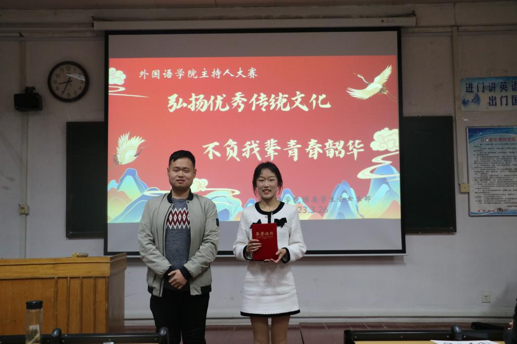 本次比赛由选手定题主持、抽取题目即兴主持、才艺展示三个环节组成,评委进行现场打分。在选手定题主持中,2号选手李燕妮以“曲园诗词大会”为题材,运用大量文言诗句,言简意深,对仗工整,给人以深思和启迪。在抽签主持中,选手们围绕中华优秀传统文化,在有限的时间内进行了精彩的主持表演,激起大家对中华优秀传统文化的共鸣。最后才艺展示环节,选手们悦耳的歌声,激情的朗诵感染了在场的每一位观众,带领大家感受源远流长、博大精深的中华优秀传统文化。经过三个环节的精彩角逐,李燕妮荣获一等奖,孙凡舒、赵乐冉荣获二等奖,王舜菡、左峻齐、田桂东荣获三等奖。
