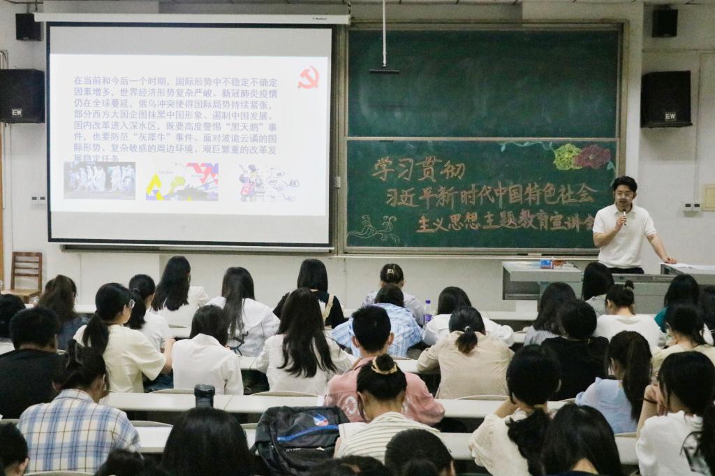 会上,宣讲团从优秀传统文化“两创”和“两个确立”科教融合两个专题进行宣讲。首先由宣讲团成员边爽从“坚持和发展中国特色社会主义政治宣言和行动纲领”的主题出发,围绕党的二十大主题、主要成就等方面对党的二十大精神进行了具体解读,积极引导同学们深刻领悟“两个确立”的决定性意义。其次由宣讲团成员唐金武围绕“推进文化自信自强,铸就社会主义文化新辉煌”主题,从新征程中意识形态工作的重大意义和面临的新挑战出发增强同学们的文化自信,鼓励同学们铸就社会主义文化新辉煌。最后,宣讲团成员田昭霖从“万山磅礴看主峰,党建引领事业兴”主题进行了细致的讲解,具体阐述了党的思想建设、精神建设、制度建设、作风建设、组织建设,加深了同学们对党的认识。
