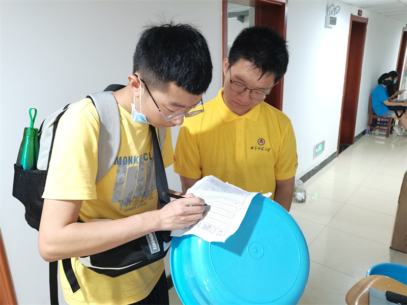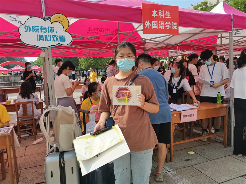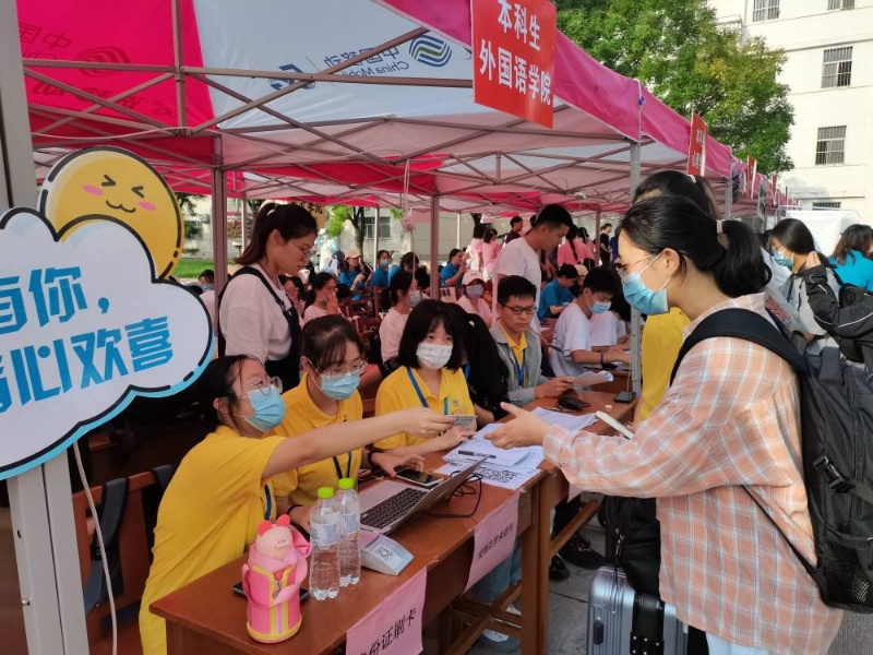 2020级学子身穿黄色文化衫,以最饱满的精神迎接各自的“二对二”新生,他们穿梭在校园各处,帮助新生搬运行李,引领新生到各报到点登记信息,解答新生的各种问题,充分展示了外院学子团结一致的良好精神风貌。此外,固定迎新点的工作人员也热情洋溢地为新生服务,有的认真整理材料核对信息,有的发放宿舍用品,有的手举相机记录迎新工作,一切报到程序都井然有序的进行着。2021级新生在采访中表示,志愿者们温暖的问候与贴心的服务让他们感到远赴他乡求学并不孤单,他们会带着希望前进,不辜负家人的期望。