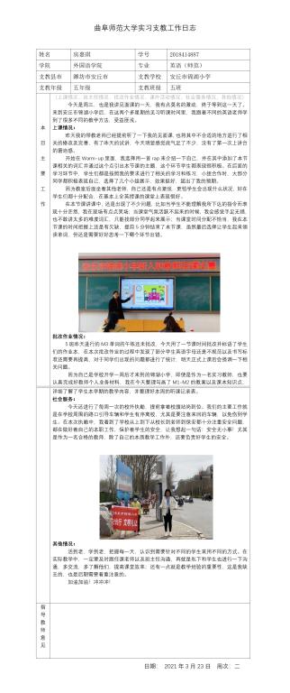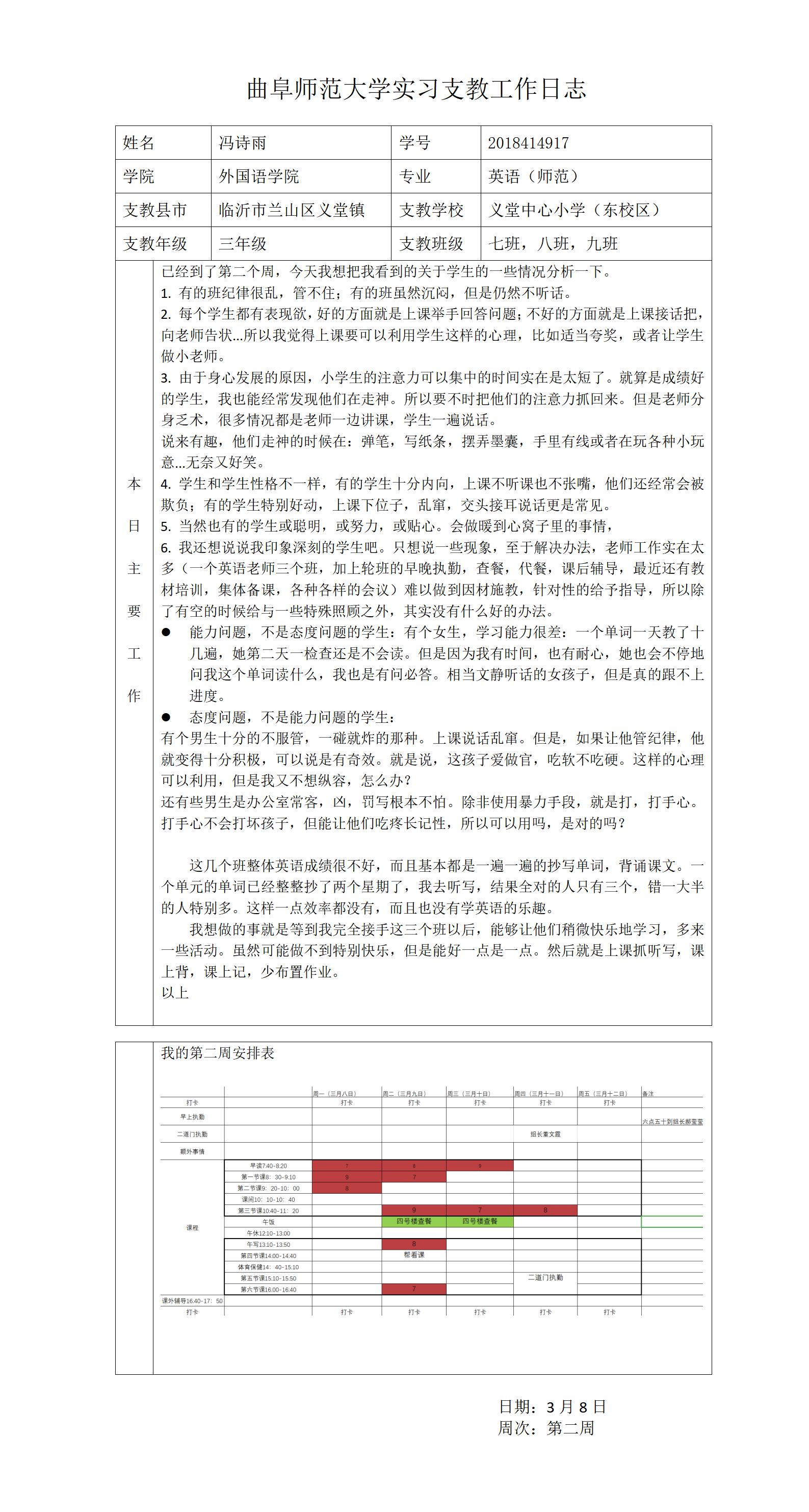 初为人师,支教实习生认真履行支教任务,担当支教责任。在与其他老师的沟通中虚心学习备课方法,在实际教学情境中不断修正自己的课堂教学方法。从一次次授课实践中积累丰富经验,充分展现曲师大优良师德师风。教室里,用耐心和责任心上好每一堂课;办公室里,用认真和专注写好每一篇实习教案。