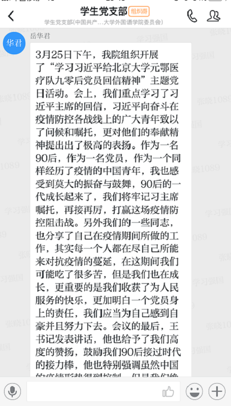 学生党支部开展“学习习近平总书记给北京大学援鄂医疗队全体“90后”党员回信精神”主题党日活动。本次主题党日活动采用“腾讯会议+学习强国”形式进行,会议由支部书记张晓同志主持,黑料社