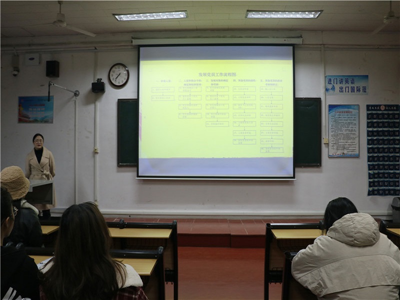 党委机构设置的基础上,带领大家重温了党的成立时间、党旗和党徽、中国共产党的性质和党的指导思想等党的基本知识以及党和共产主义青年团的关系,并强调了入党的严肃性,要求同学们端正入党动机、认真严谨对待。随后,她向同学们详细地介绍了入党流程,并指出这是复杂严格的过程。最后,张晓老师从入党申请书格式及内容等多个方面向同学们介绍了怎样写入党申请书,并鼓励同学们以实际行动向党组织靠拢。