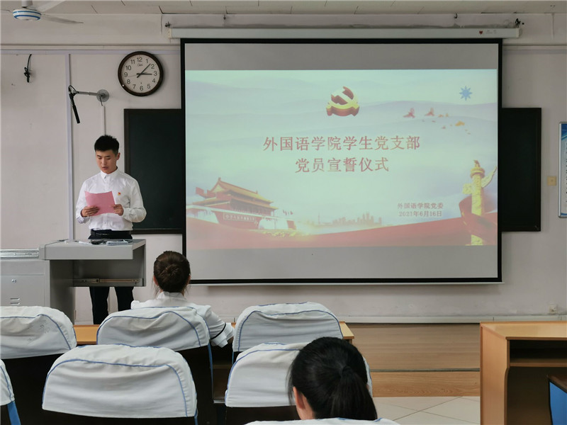 本次活动由党课学习、预备党员入党宣誓以及学习灯塔大课堂三部分组成。首先,张晓同志从始终对党忠诚和切实践行“两个维护”方面对党员进行思想教育。她指出,学院的发展离不开每个人的努力,只有听党指挥,学院的发展才能蒸蒸日上。紧接着,入党宣誓仪式在《国际歌》中拉开帷幕。仪式伊始,党支部组织委员李鑫宣读了参加入党宣誓仪式的预备党员名单。在赵文彬同志的带领下,与会全体成员面向党旗,右手握拳逐句宣誓,铿锵的誓言充分展现了坚定的决心。宣誓完毕后,新党员代表管健同志发言,她强调,党员应将入党誓词作为一生的追求和信念,不负党的期望,奋斗实践终身。接着,老党员代表王仁杰同志向新党员寄语,他提到新老党员要在以习近平同志为核心的党中央领导下,携手共进,扎实工作,开拓创新。随后,党委副书记王作茂发表讲话,他在对新党员表示祝贺的同时,也提出了明确要求,希望同学们牢记党的宗旨,为全面建设社会主义现代化国家贡献自己的力量。最后,与会全体成员集体学习观看了“灯塔大课堂—中国共产党的建立”相关视频。