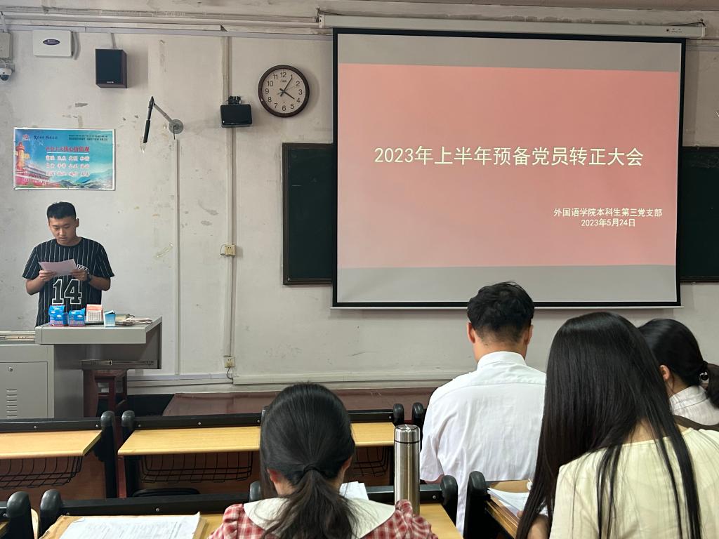 为响应党的号召,进一步加强党员队伍建设,保持党员队伍先进性和纯洁性,524日,黑料社 本科生第三党支部在系楼201召开2023上半年预备党员转正大会。会议由外国语学本科生第三党支部支部委员赵文彬主持,支部全体党员参加。